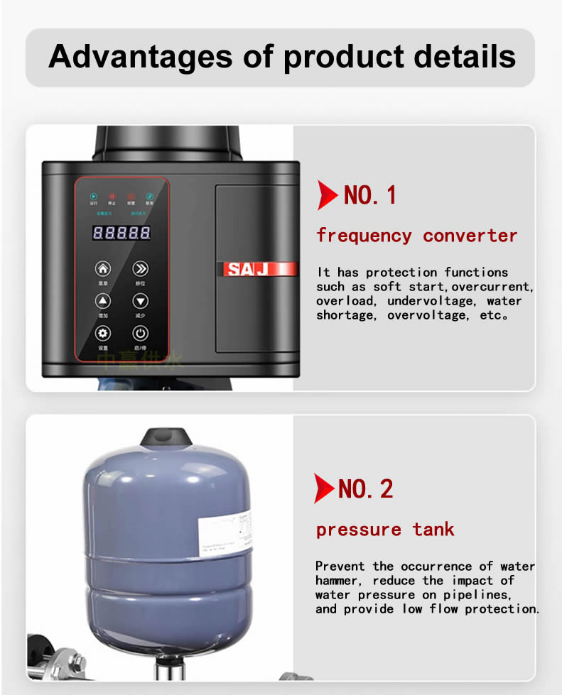 The fully automatic variable frequency constant pressure water supply pump is a type of fully automatic booster pump that is directly connected in series on the pipeline or installed on the edge of the water tank. It can automatically work and stop according to the water usage situation, and has a series of advantages such as stable pressure, cleanliness, hygiene, small size, low noise, energy saving, environmental protection, adjustable parameters, and simple use. It is an ideal water supply pump for boosting household tap water, villas, small hotels, farmhouses, small-scale water supply projects, and other areas.